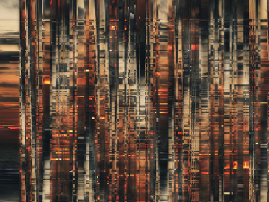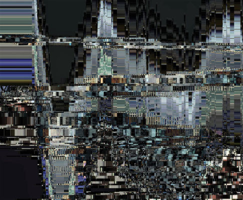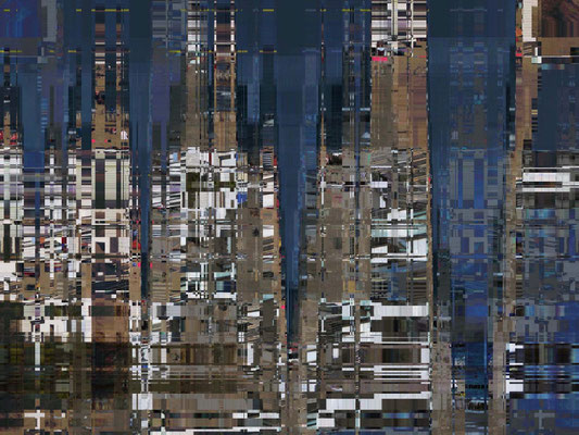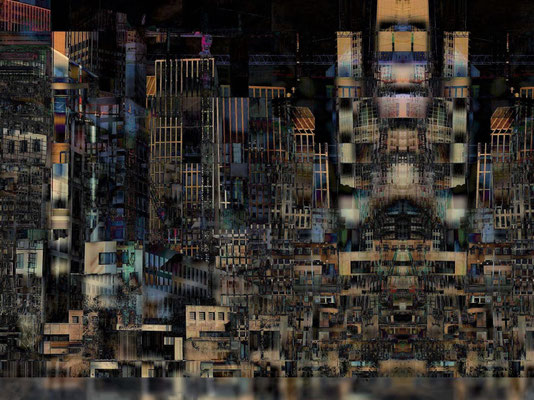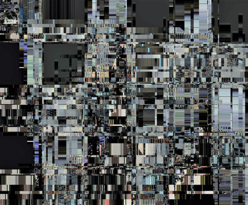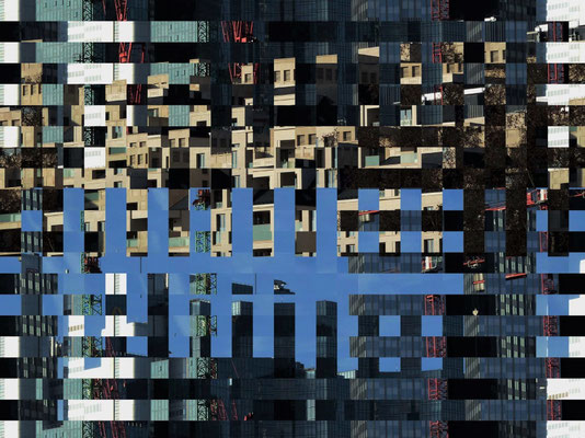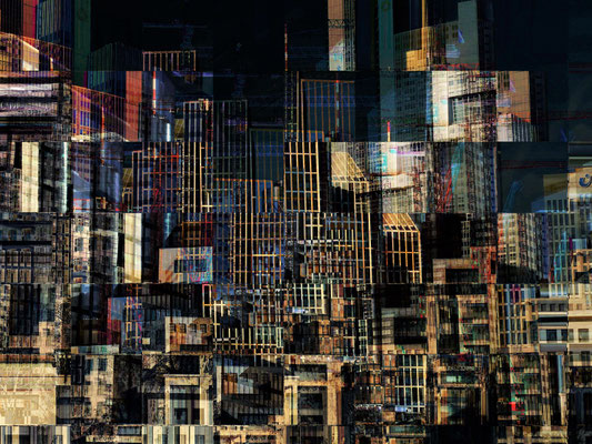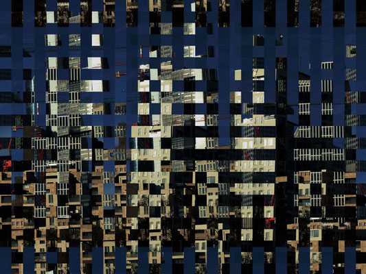 Die ersten vier Collagen im ersten Block zeigen Wuhan. Zerschneidungen und verschwommene Negativabbildungen symbolisieren die von Covid 19 ausgehende Gefahr. Bei den nachfolgenden meist digital erstellten Abbildungen veranschaulichen vergraute, farb- bzw. formreduzierte , vertikal und horizontal zerschnittene Stadtlandschaften kalte, seelenlose Städte. Diese Wirkung erzeugen in rechteckigen und quadratischen Grundformen, großen Hell-Dunkelkontrasten nüchtern und kalt wirkende Stadtansichten in weiteren Abbildungen. Collagen erzeugen mit vorherrschend dunkelblauen Farben aus Positiv - Negativfotos, sowie digital zerschnittenen und neu zusammengesetzten Fotos mit graphischen Elementen eine erdrückende und verwirrende Wirkung. Die Abbildungen im vorletzten Block basieren auf vertikal und horizontal zerschnittenen und stark vergrößerten Fotos. Unschärfen erzeugen den Eindruck von Smog und Schmutz.